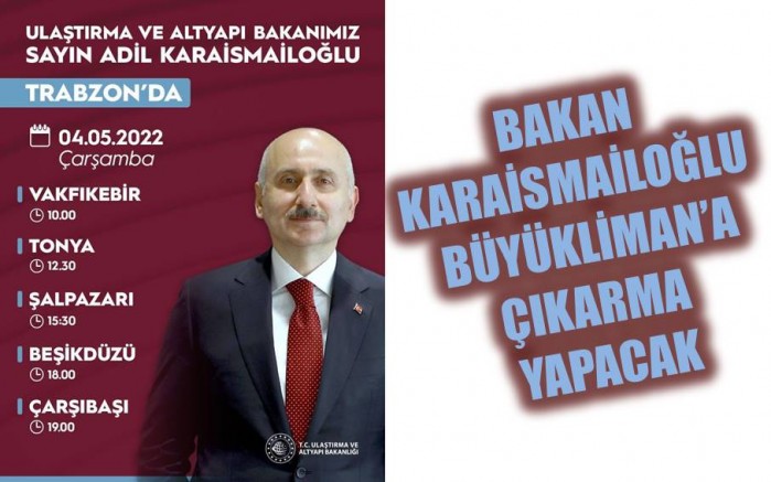 Bakan Karaismailoğlu, saat 10.00’da Vakfıkebir’de, saat 12.30’da Tonya’da, saat 15.30’da Şalpazarı’nda, saat 18.00’da Beşikdüzü’nde ve son olarak da saat 19.00’da Çarşıbaşı’nda çeşitli ziyaretlerde bulunacak ve halkla bayramlaşacak.