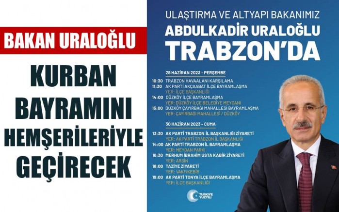 Bakan Uraloğlu, 29 Haziran Perşembe günü tarifeli uçak ile Trabzon’a gelecek. Bakan olmasını büyük coşku ve sevinçle karşılayan hemşerileri, saat 10.30'da Trabzon Havalimanı'nda Bakan Uraloğlu'nu karşılayacak. Uraloğlu havalimanından Akçaabat'a geçerek, saat 11.30'da AK Parti Akçaabat İlçe Başkanlığı'nda vatandaşlarla bir araya gelecek. Bakan Uraloğlu, 14.00'da Düzköy, 15.00'te ise Çayırbağı'nda hemşerileriyle bayramlaşacak.