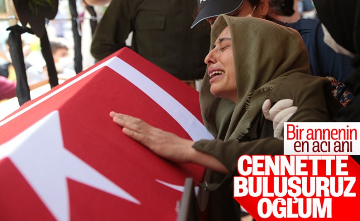 Yakınlarının desteğiyle oğlunun tabutuna sarılan anne Fadıma Kahya, "Oy ciğerim oy, yaktın ciğerim. Cennette buluşuruz" diyerek ağladı.
