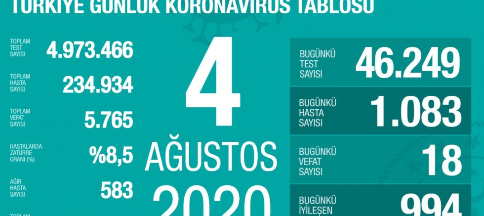 Sağlık Bakanı Fahrettin Koca, Türkiye'de Koronavirüs nedeniyle 18 kişinin daha hayatını kaybettiğini, 1083 yeni vaka tespit edildiğini açıkladı. Böylece toplam ölü sayısı 5 bin 765'e, vaka sayısı 234 bin 934'e yükseldi.