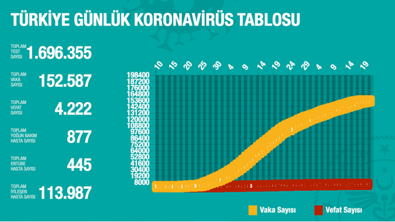 Sağlık Bakanı Fahrettin Koca, Türkiye'de yeni tip Koronavirüs (Covid-19) nedeniyle 23 kişinin daha hayatını kaybettiğini, 927 yeni tanı konduğunu açıkladı. Böylece Koronavirüs kaynaklı hayatını kaybedenlerin sayısı 4 bin 222'ye, vaka sayısı 152 bin 587'ye yükseldi.