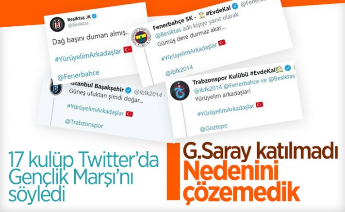 Süper Lig'in 17 kulübü, 19 Mayıs Atatürk'ü Anma Gençlik ve Spor Bayramı nedeniyle resmi Twitter hesaplarından Gençlik Marşı'nı paylaştılar. Katılmayan tek kulüp ise Galatasaray oldu.