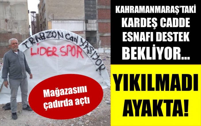 Yapılan paylaşımda şu ifadelere yer verildi: “TRABZONLU KARDEŞLERİMİZE!.. Kahramanmaraş’ta yaşanan deprem felaketinde Trabzon Caddesi’ndeki işyerleri yıkılan esnaf kardeşlerimizden biri olan LİDER SPOR mağazası sahibi Yahya CANLI kardeşimiz cadde üzerindeki işyerinin faaliyetini çadır kurarak devam ettirmeye başlamıştır. Trabzon’daki Maraş Caddesi esnaflarımızın memleketimizdeki Trabzon Caddesindeki esnaf kardeşlerimize desteklerini bekler, “YIKILDIĞI YERDEN YENİDEN AYAĞA KALKMAYA ÇALIŞAN” Yahya kardeşimize hayırlı işler dileriz. #kahramanmaraştrabzoncaddesi”
