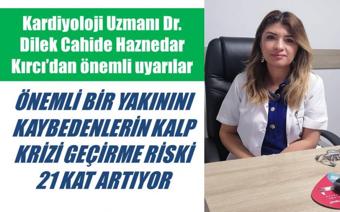 Özel İmperial Hastanesi Kardiyoloji Uzmanı Dr. Dilek Cahide Haznedar Kırcı, ağır stresin kalp krizi riskinin yanı sıra stresle oluşan geçici bir kalp krizi olarak bilinen 'stres kardiyomyopati' riskini de arttırdığını söyledi. Önemli bir yakınını kaybedenlerin kalp krizi geçirme riskinin 21 kat fazla olduğuna dikkat çeken Kırcı, "Araştırmacılar, yaşamınızda önemli yere sahip bir yakınınızı kaybettiğinizde, kaybınızın ertesi günü kalp krizi geçirme riskinizin 21 kat, bir hafta sonrasında ise 6 kat artmış olduğunu belirtmektedir. Ağır stresi takiben kalp krizi riskiniz artarken, temel olarak stresle oluşan geçici bir kalp krizi olarak bilinen stres kardiyomyopati riski de artar" dedi.