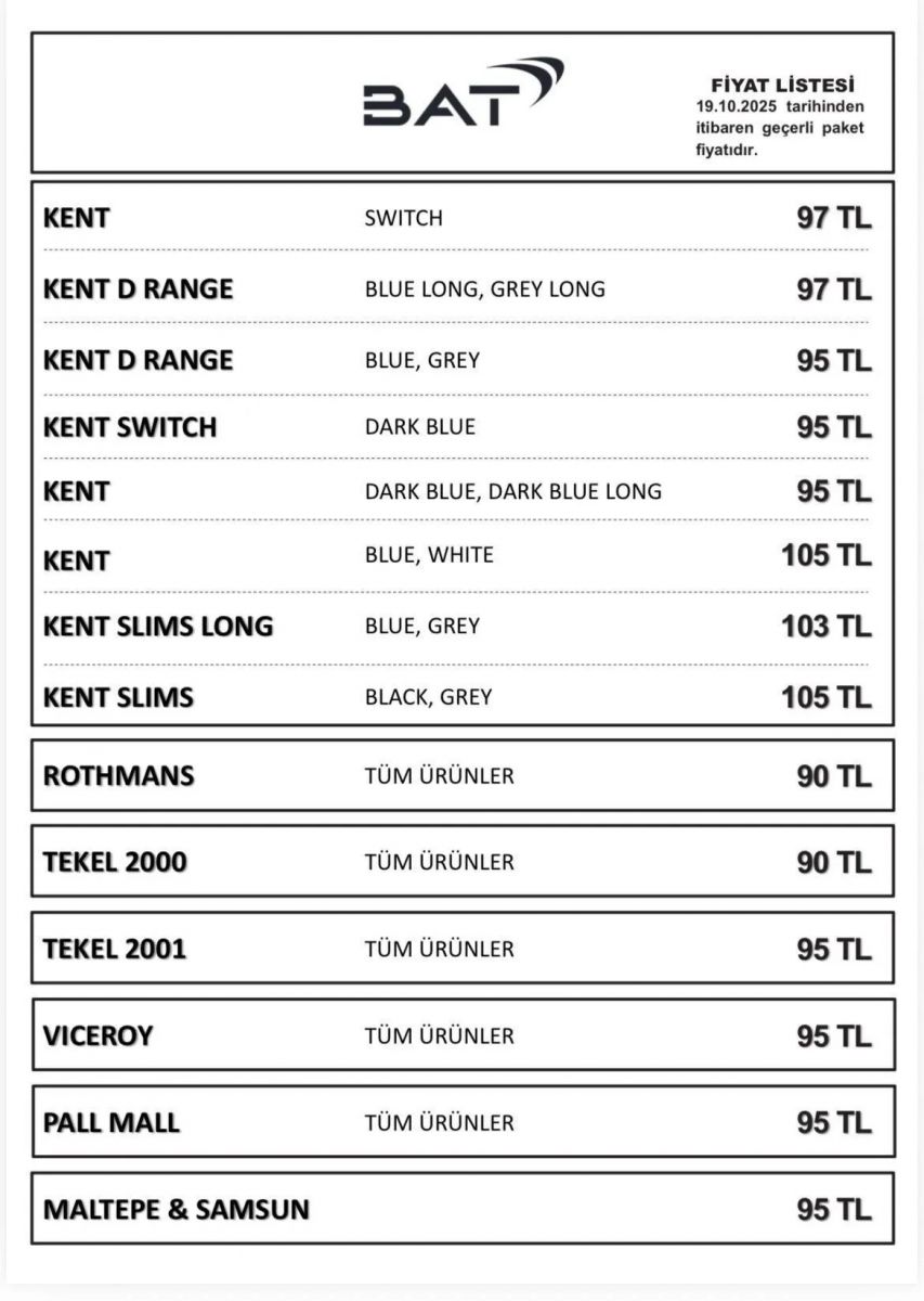 BAT’ın yayımladığı yeni fiyat listesine göre Kent markasının farklı serileri 95 ila 105 TL arasında değişiyor. Kent Blue ve Kent Slims 105 TL’ye yükselirken, Kent Switch ve Kent D Range serileri 95–97 TL bandında satılacak. Rothmans ve Tekel 2000 markalarının fiyatı 90 TL olarak belirlenirken, Tekel 2001, Viceroy, Pall Mall ve Maltepe & Samsun ürünleri 95 TL’ye çıktı.