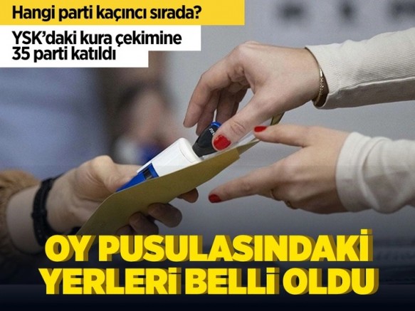 31 Mart Pazar günü yapılacak Mahalli İdareler Genel Seçimleri'ne katılacak siyasi partilerin oy pusulasındaki yerlerini belirlemek için kura çekimi yapıldı. Oy pusulasında AK Parti 1, CHP 18, DEM Parti 9, MHP 31, İYİ Parti 2, Saadet Partisi 34'üncü sırada yer alacak.