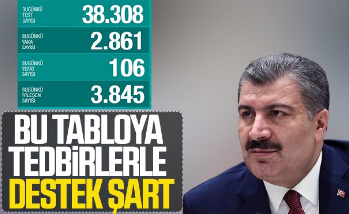 Sağlık Bakanı Fahrettin Koca "Şifa bulanların toplam sayısı ise 25 bini geçti. Testlerin pozitif çıkma oranı azalıyor. Bu tabloya tedbirle destek şart." dedi.Koca, "Son 24 saatte 3 bin 845 hasta taburcu edildi, 2 bin 861 yeni tanı kondu. Taburcu olanların sayısı yeni hastaların sayısından 984 fazla." dedi.