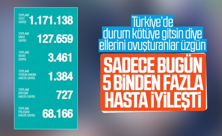 Güncellenen verilere göre, Türkiye'de koronavirüs salgınında bugün 5 bin 15 kişi iyileşerek sağlığına kavuştu.Koronavirüs tedavisi tamamlananların sayısı 68 bin 166 oldu.
