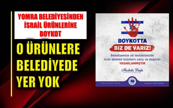 Yomra Belediyesi, Filistin halkının yaşadığı zorlukları hafifletmek amacıyla, İsrail'i destekleyen markaların kafeteryalarda ve Yomra Kültür Merkezi’nde satışının ve dağıtımının yasaklandığını duyurdu. Yomra Belediyesi'nin resmi sosyal medya hesabından yapılan açıklamada "Yomra Filistin'in yanında! Belediyemize ait kafeteryalarda ve Yomra Kültür Merkezi’nde işgalci İsrail'e ait markaların ürünlerine yer yok. Zalimliğe ve haksızlığa karşı elimizden geleni yapmaya devam edeceğiz." ifadelerine yer verildi.